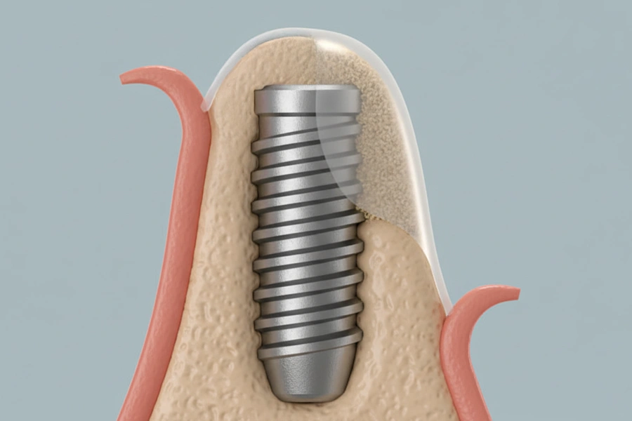 歯を失って時間が経つと、歯を支える骨(歯槽骨)が痩せてしまいます。GBRは、骨が足りない部分に骨の材料を置き、その上を人工膜で覆う処置です。これにより、歯肉などの組織が入り込むのを防ぎ、骨が再生するスペースを確保します。